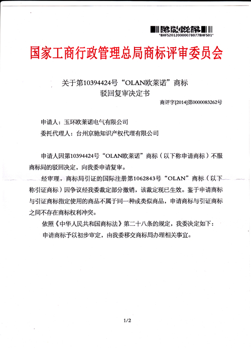 “OLAN歐萊諾”商標(biāo)駁回復(fù)審決定書