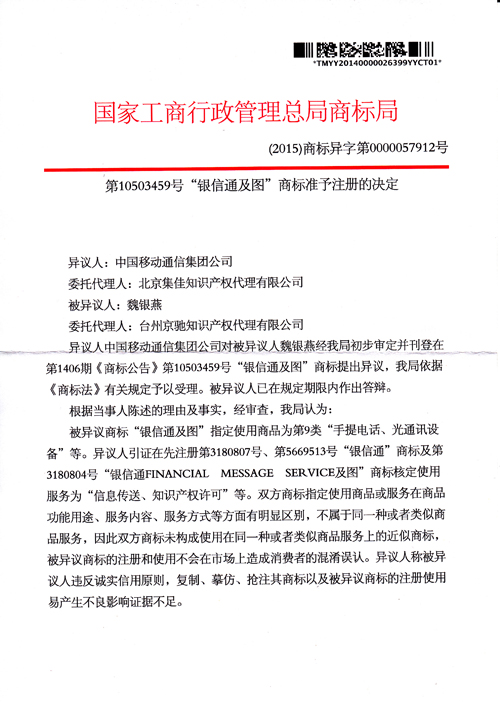 “銀信通及圖”商標(biāo)準(zhǔn)予注冊的決定