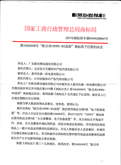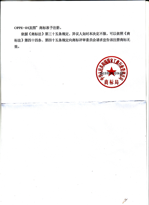 “歐貝奇OPPE-IH及圖”商標(biāo)準(zhǔn)予注冊的決定