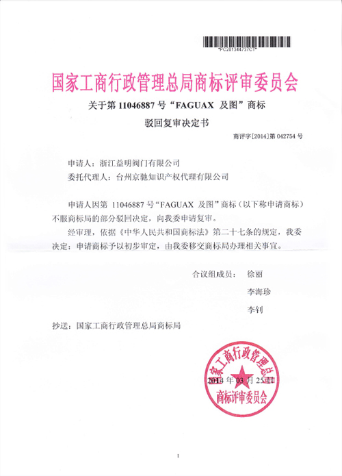 “FAGUAX及圖”商標駁回復(fù)審裁定書