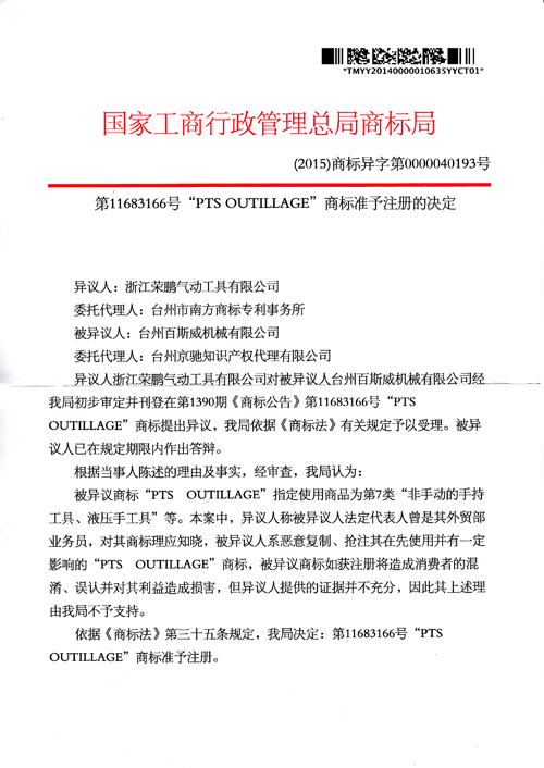 “PTS OUTILLAGE”商標準予注冊的決定