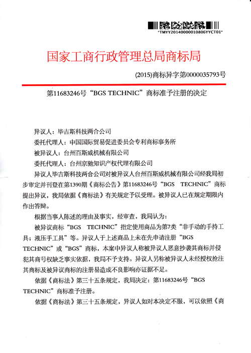 “BGS TECHNIC”商標準予注冊的決定