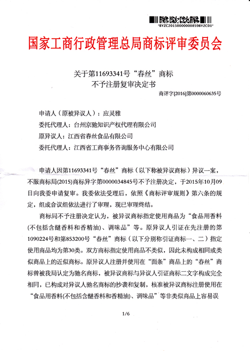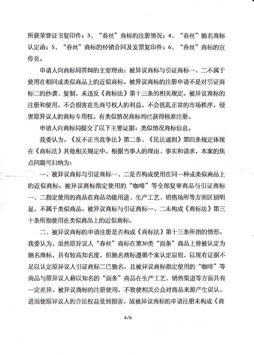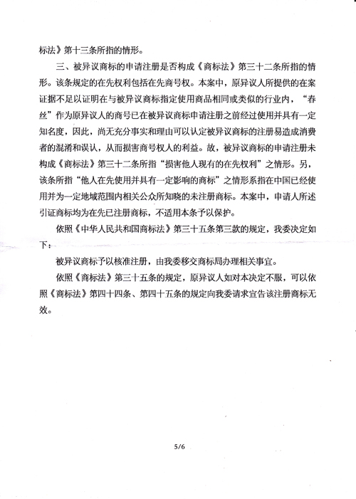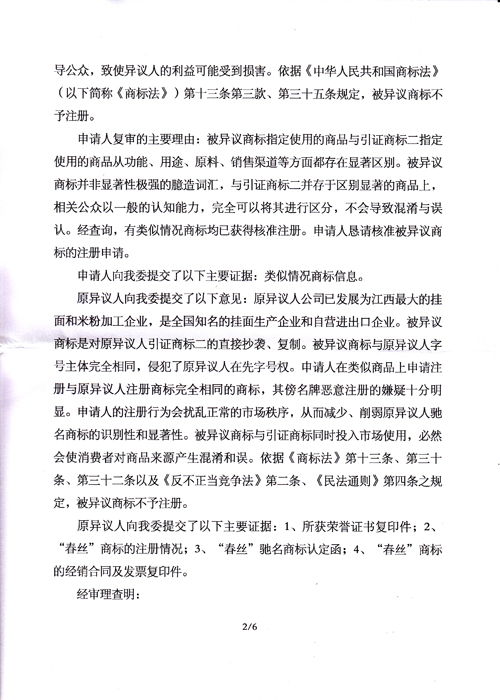 “春絲”商標(biāo)不予注冊(cè)復(fù)審決定書
