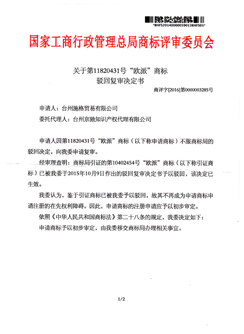 “歐派”商標駁回復審決定書