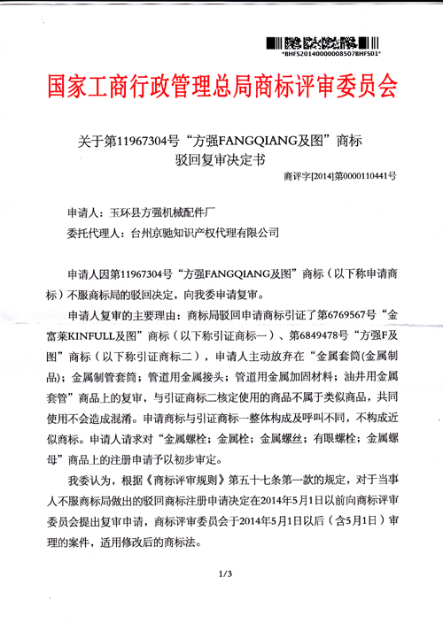 “方強(qiáng)FANGQIANG及圖”商標(biāo)駁回復(fù)審決定書(shū)