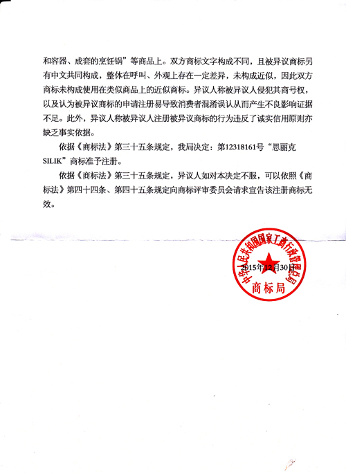 “思麗克SDILIK”商標(biāo)準(zhǔn)予注冊的決定