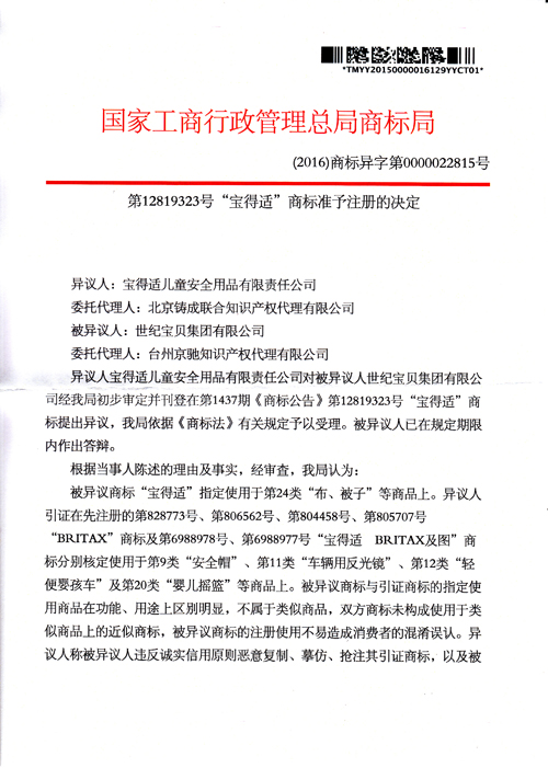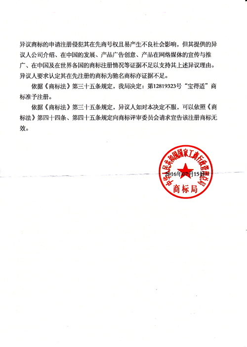 “寶得適”商標(biāo)準(zhǔn)予注冊的決定