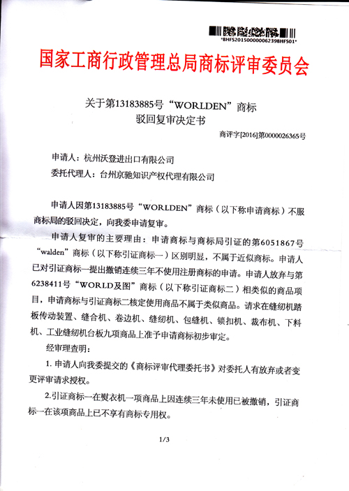 “WORLDEN”商標(biāo)駁回復(fù)審決定書