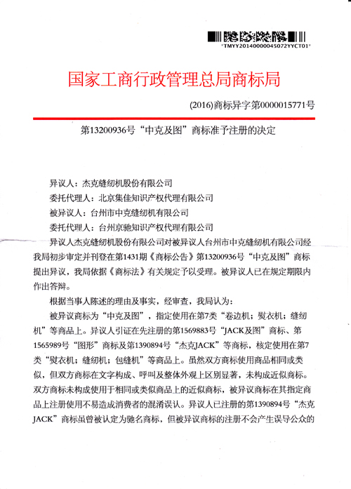 “中克及圖”商標(biāo)準(zhǔn)予注冊的決定