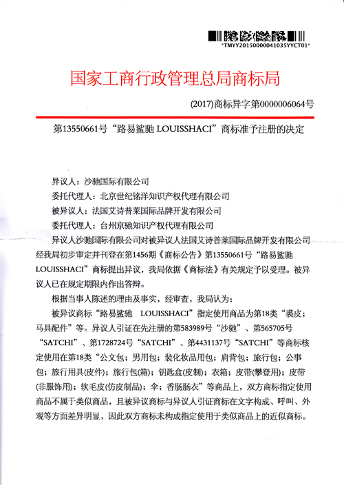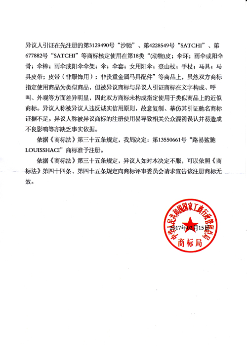 “路易鯊馳LOUISSHACI”商標準予注冊的決定