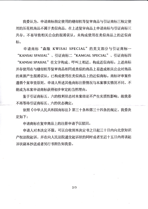 “森順KWISAI SPECIAL”商標(biāo)駁回復(fù)審決定書