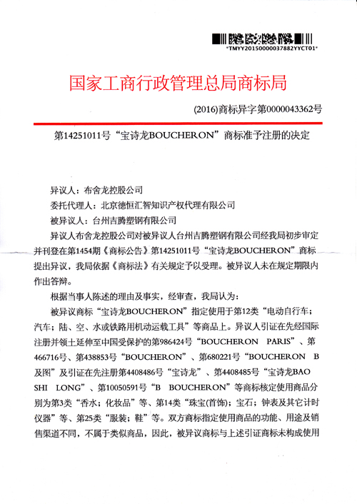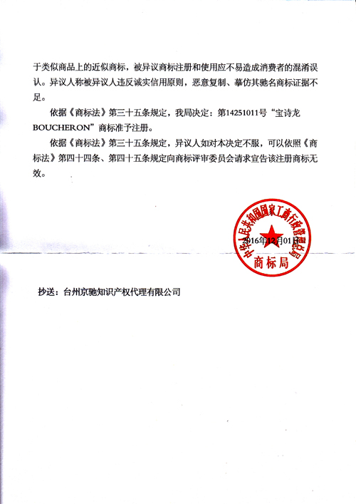 “寶詩龍BOUCHERON”商標準予注冊的決定