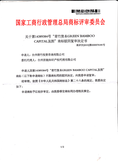 “青竹資本GREEN BAMBOO CAPITAL及圖”商標駁回復審決定書