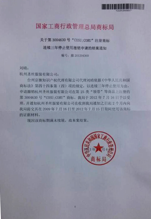 “COSU;CORU”注冊商標連續三年停止使用撤銷申請的結案通知