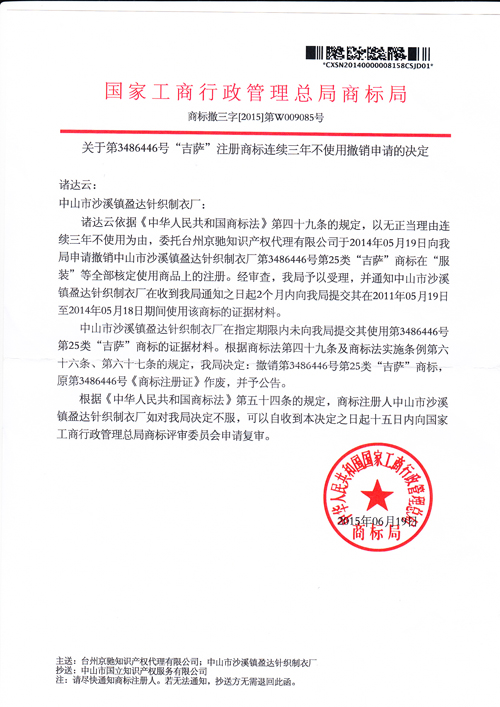 “吉薩”注冊商標連續三年不使用撤銷申請的決定