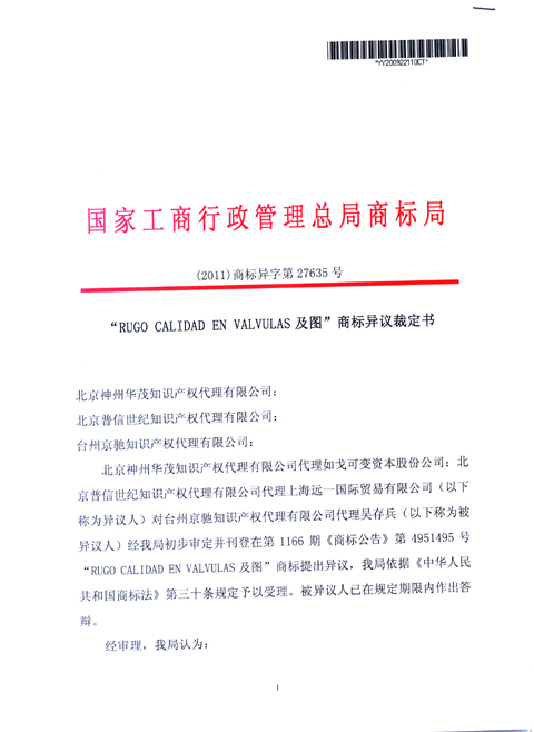 > “RUGO CALIDAD EN VALVULAS及圖”商標(biāo)異議裁定書