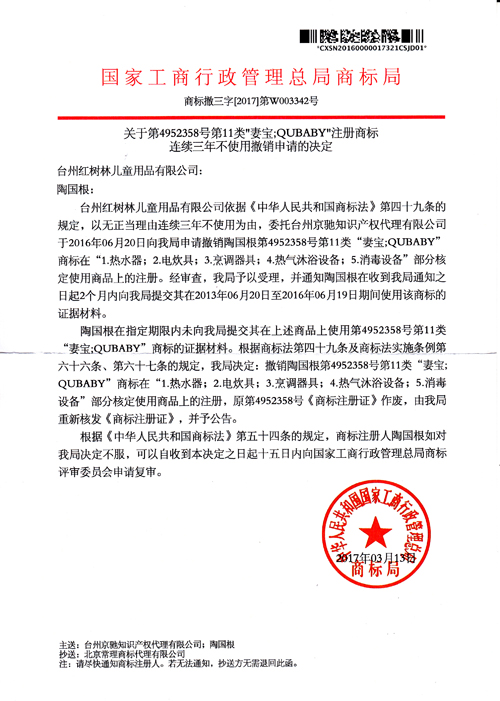 第11類“妻寶;QUBABY”注冊商標連續三年不使用撤銷申請的決定