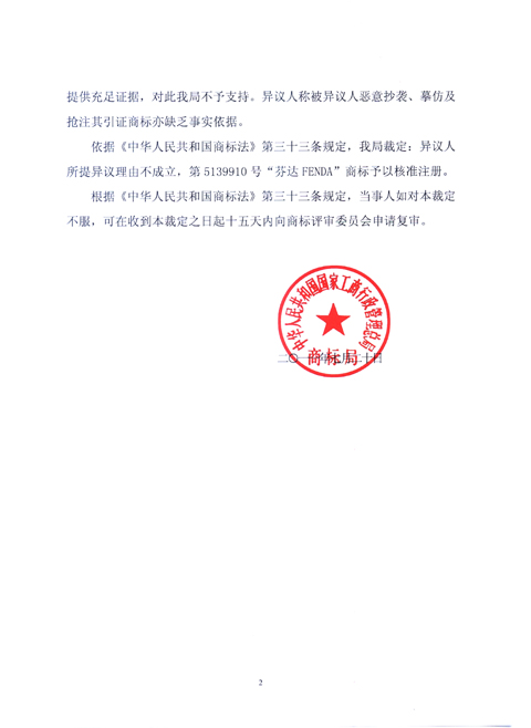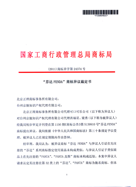 “芬達(dá)FENDA”商標(biāo)異議裁定書