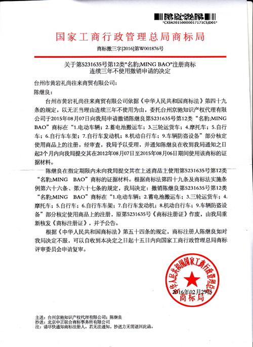 “名豹;MINGBAO”注冊商標連續三年不使用撤銷申請的決定