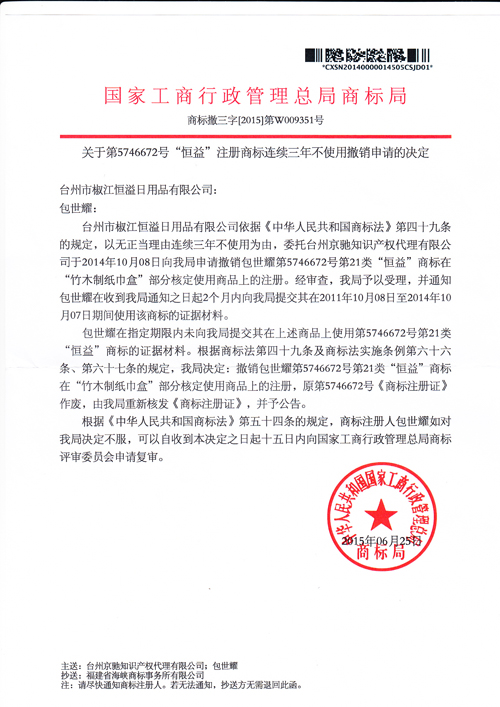 “恒益”注冊商標連續三年不使用撤銷申請的決定