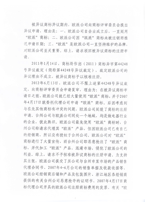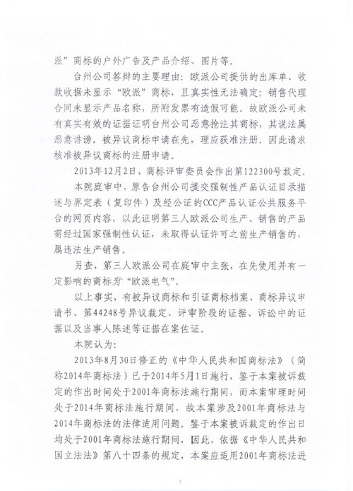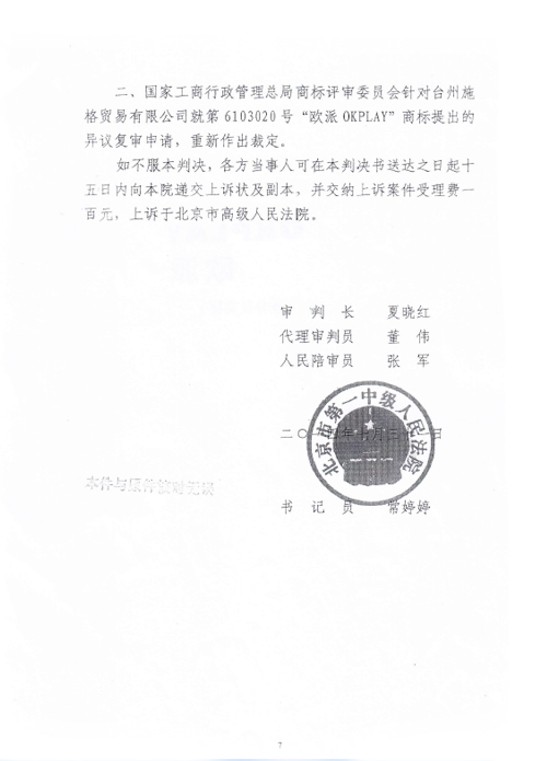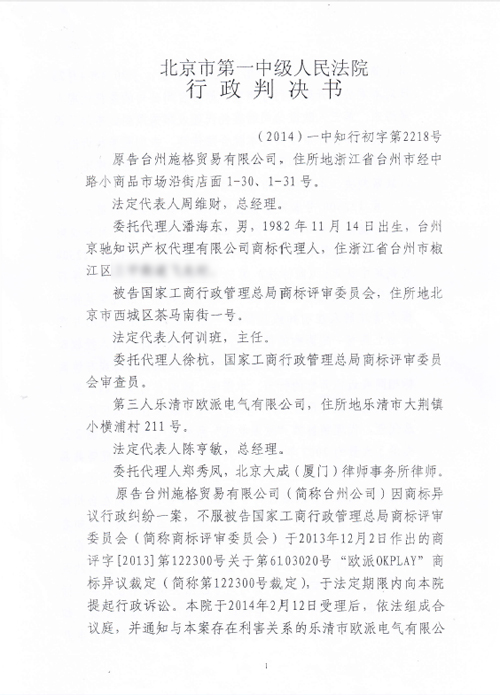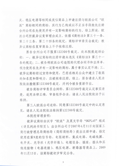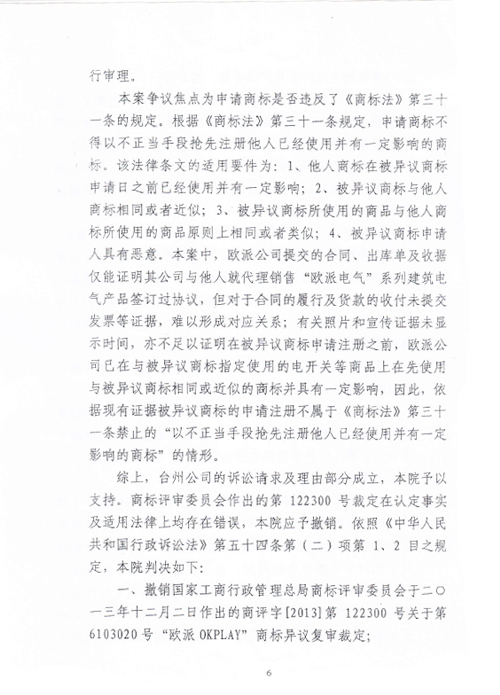“歐派OKPLAY”商標(biāo)行政訴訟判決書