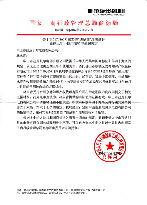 “迪尼熊”注冊商標連續(xù)三年不使用撤銷申請的決定