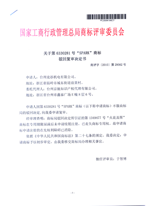 “SPARK”商標(biāo)駁回復(fù)審決定書