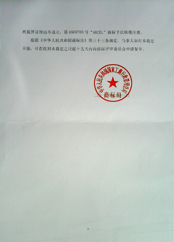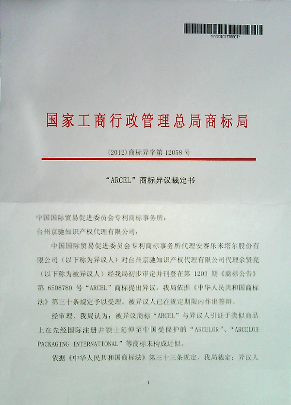 “ARCEL”商標(biāo)異議裁定書(shū)
