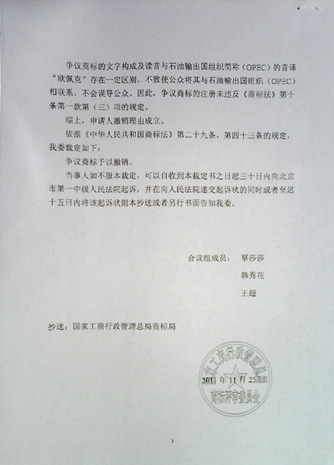 “歐派克”商標(biāo)爭(zhēng)議裁定書(shū)