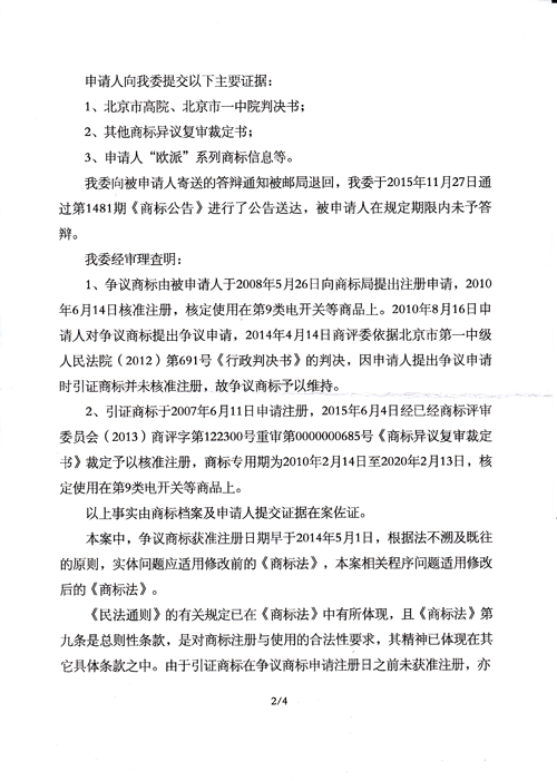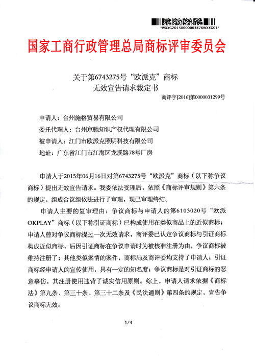 “歐派克”商標(biāo)無效宣告請求裁定書