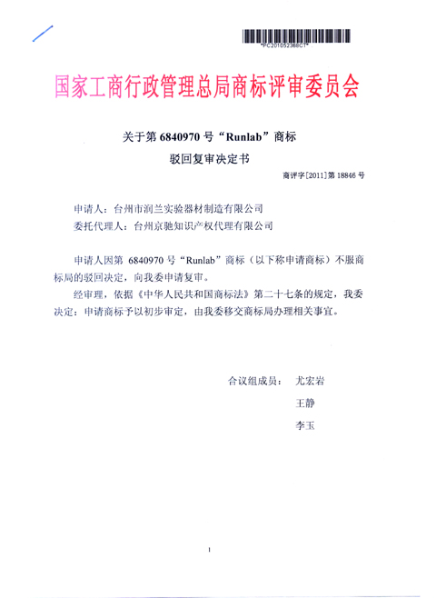 “RUNLAB”商標駁回復審決定書