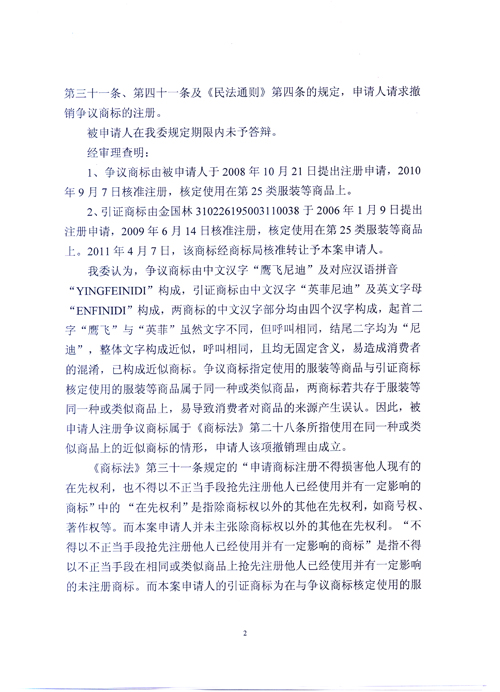 “鷹飛尼迪YINGFEINIDI”爭議裁定書