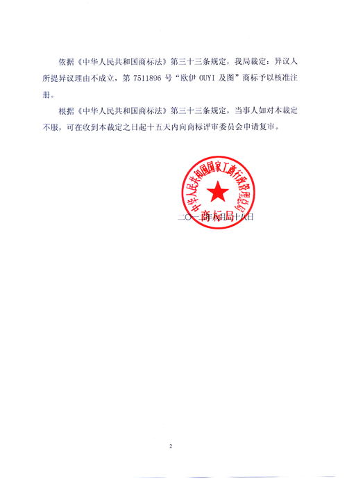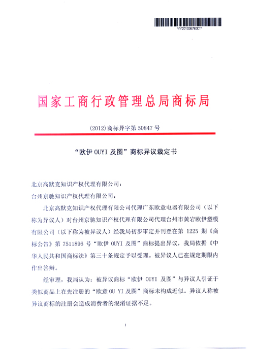 “歐伊OUYI及圖”商標(biāo)異議裁定書