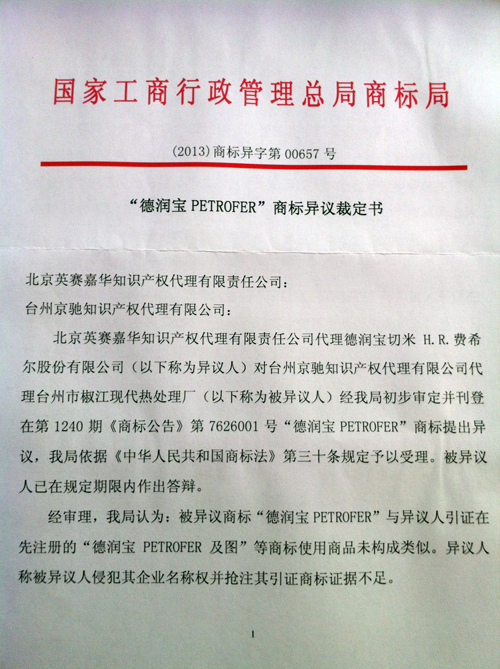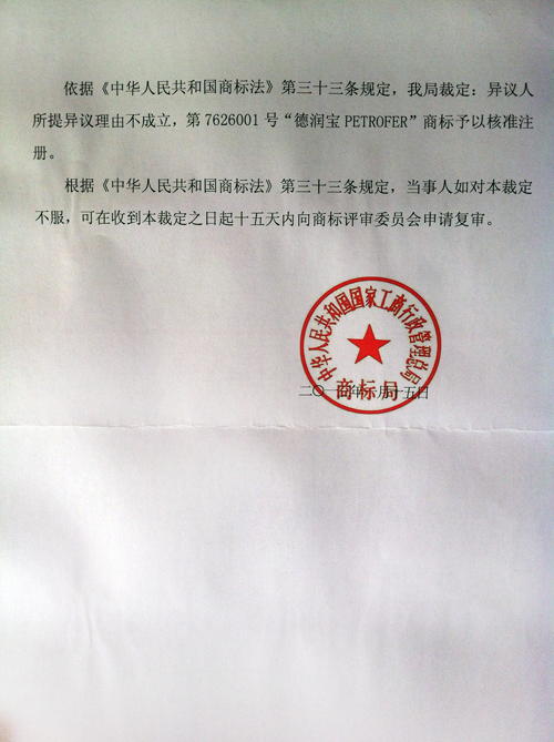 > “德寶潤PETROFER”商標異議裁定書