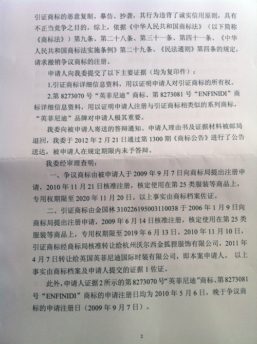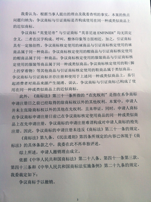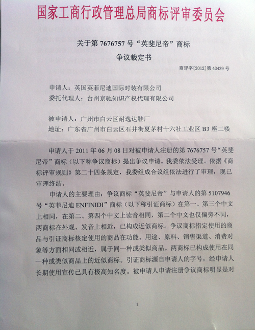 第7676757號(hào)“英婓尼帝”商標(biāo)爭(zhēng)議裁定書(shū)