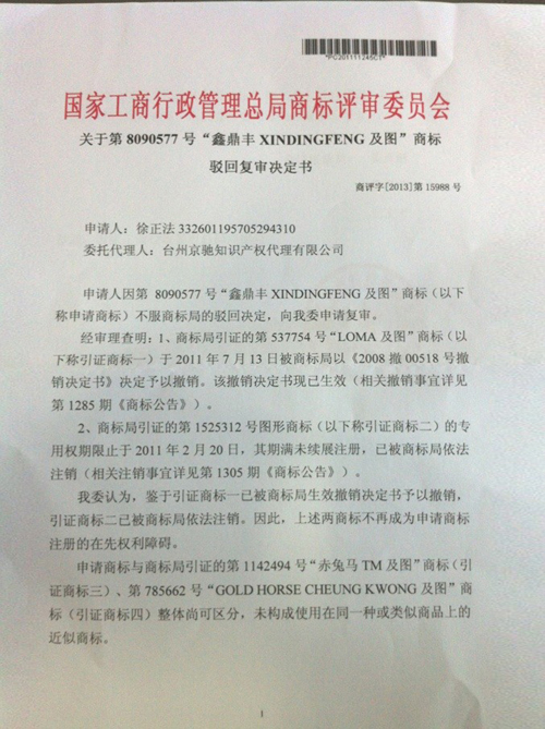 “鑫鼎豐XINDINGFENG及圖”商標駁回復審決定書