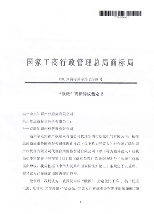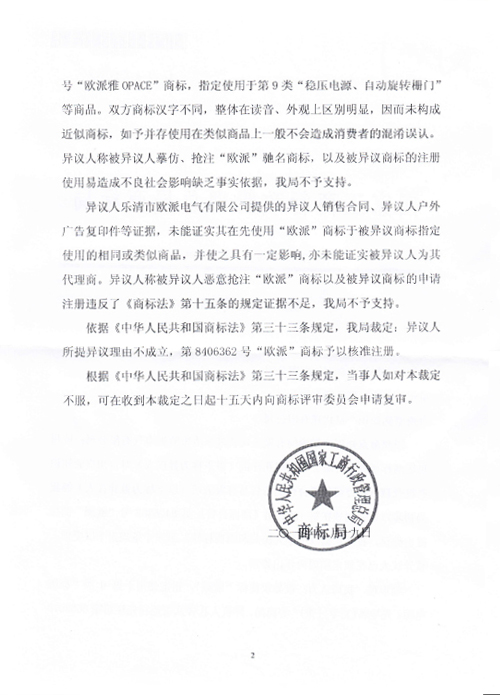 “歐派”商標異議裁定書