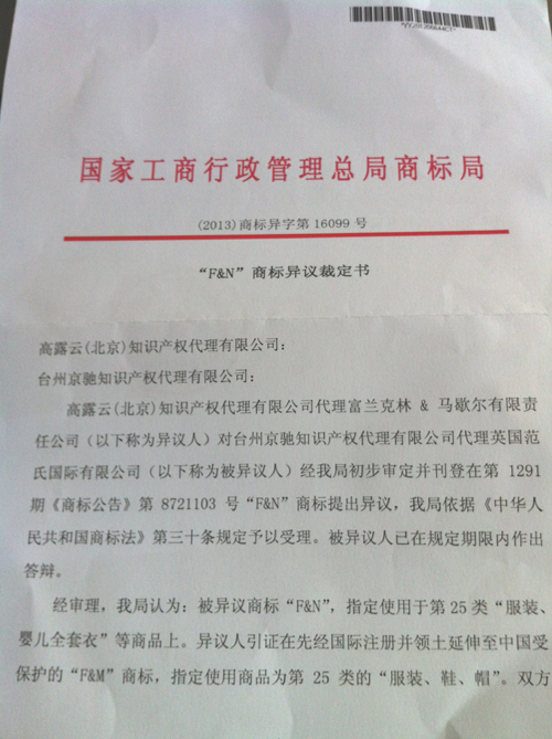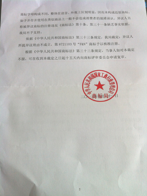 “F&N”商標異議裁定書