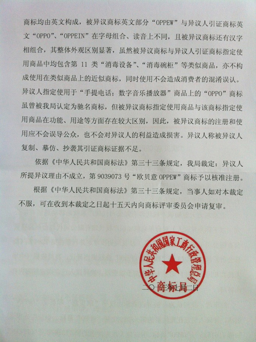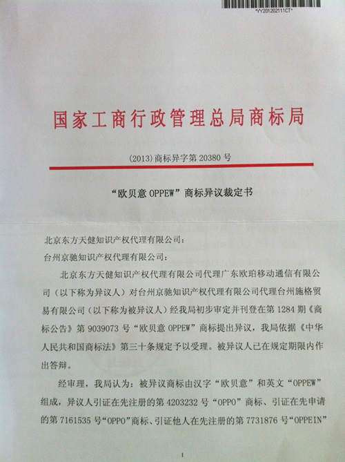 “歐貝意OPPEW”商標異議裁定書