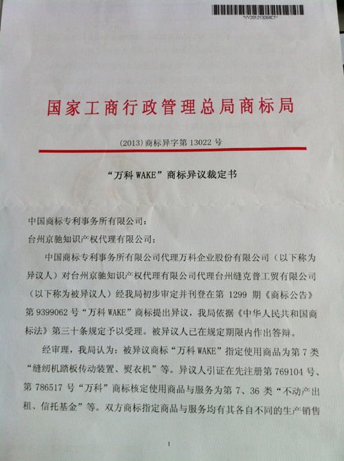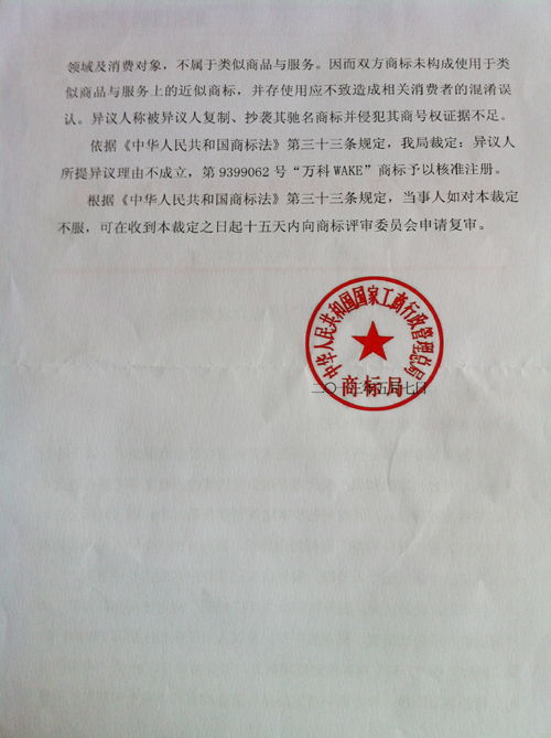 “萬科WAKE”商標異議裁定書