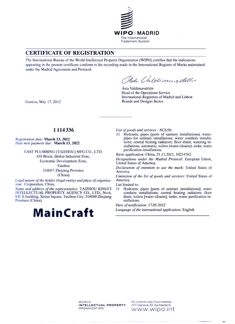 MainCraft馬德里國(guó)際注冊(cè)證書